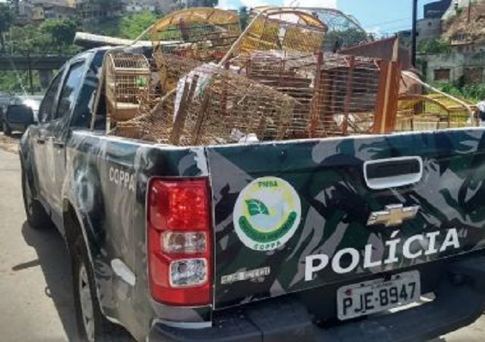Guarnições da Companhia Independente de Polícia de Proteção Ambiental (Coppa) apreendeu 93 pássaros e seis jabutis que eram comercializados ilegalmente na Baixa do Fiscal, em Salvador. A ação foi deflagrada na manhã deste domingo (18), durante a Operação Feira Livre. Onze pessoas foram flagradas comercializando os animais silvestres: Carlos Alberto Ferreira de Santana, Fernando Pereira de Miranda, Amilton Batista Miranda, Edvaldo de Jesus Souza, Valdir Farias de Almeida, Joselito Souza Barbosa, Lourival da Conceição, Linaldo Pinto Tavares, Vagner da Silva Sanches, Alexandro Martins dos Santos e Rodolfo Varjão Carolino dos Santos. Todos foram apresentados na Central de Flagrantes. O crime de comercialização ilegal de animais silvestres está previsto no artigo 29 da Lei 9.605/98. A pena prevista é de seis meses a um ano de detenção, além de multa. Se a espécie estiver ameaçada de extinção, a pena passa para de nove meses a um ano e meio de detenção.