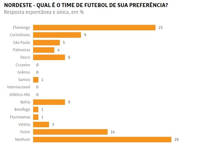 Uma pesquisa feita pelo Datafolha apontou a torcida do Bahia como a maior do Nordeste com 6% da preferência. Já os torcedores do Vitória aparecem com 3%. Considerando a margem de erro, que é de quatro pontos para mais ou para menos, os dois rivais estão tecnicamente empatados. Flamengo com 23% e Corinthians com 9% lideram a preferência na região Sudeste. O Vasco aparece com o mesmo percentual do Bahia. De acordo com o Datafolha, a pesquisa foi realizada entre os dias 29 e 30 de janeiro deste ano. Foram ouvidas 2.826 pessoas em 1774 municípios. Na visão mais macro, a pesquisa apontou que outro empate técnico entre as torcidas de Flamengo e Corinthians, considerando o limite da margem de erro. Os flamenguistas foram contabilizados com 18%, enquanto que os corintianos aparecem com 14%. No território nacional, Bahia e Vitória aparecem com 1% dos torcedores.