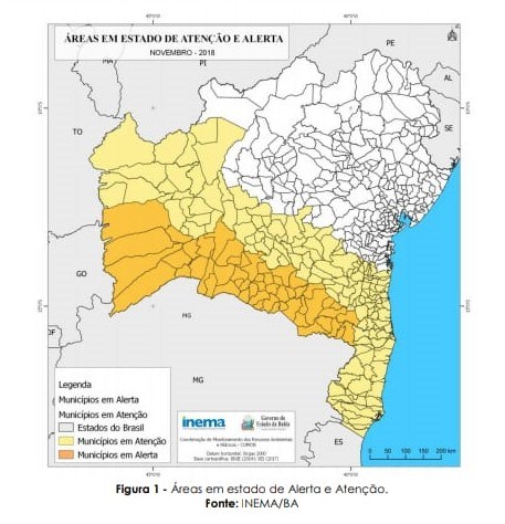 O Instituto de Meio Ambiente e Recursos Hídricos da Bahia, através da Sala de Situação, soltou um boletim nesta segunda-feira (05) informando que, nas próximas 24h, municípios das regiões Centro-Sul e Oeste da Bahia têm condições atmosféricas favoráveis a ocorrência de chuvas. Dos 417 municípios baianos, são 53 em estado de alerta e 93 em estado de atenção.