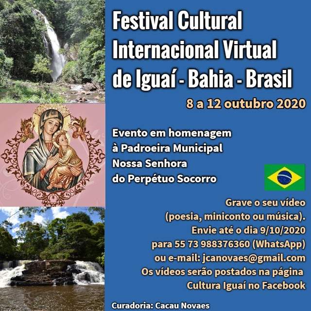 Estão abertas as Inscrições para o Festival Cultural Internacional Virtual de Iguaí, Bahia, Brasil, que acontecerá de 08 a 12 de outubro 2020. O evento acontece paralelamente à Festa da Padroeira Municipal de Iguaí, Nossa Senhora do Perpétuo Socorro.
