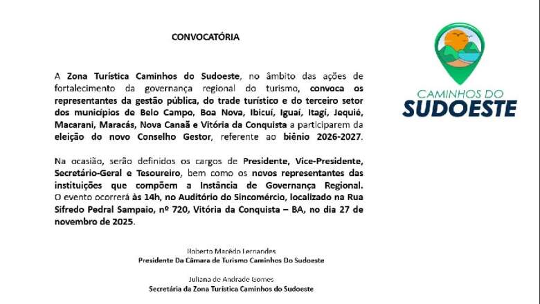 CONVOCATÓRIA: Zona Turística Caminhos do Sudoeste 13 de novembro de 2025 :: 17:38 13 de novembro de 2025 :: 17:38 A Zona Turística Caminhos do Sudoeste, convoca os representantes da gestão pública, a participarem da eleição do novo Conselho gestor, referente ao biênio 2026/2027. Segue convocatória abaixo: Redação.1 13 de novembro de 2025 :: 17:38